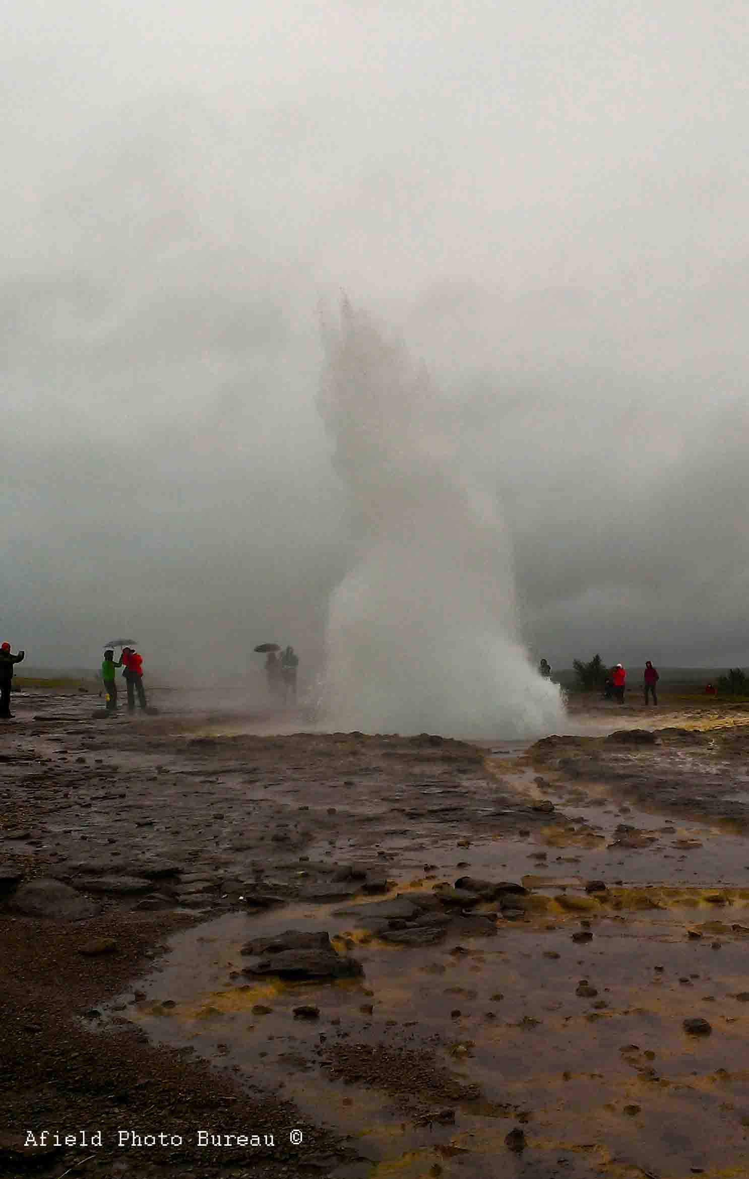 The next stop was the valley of Haukadalur and the two most popular geysers in Iceland, Geysir and its more reliable neighbor Strokkur. The rain did not give us much of a break on this stop either but we managed to have a good look around and saw Strokkur do it’s thing while Geysir remained quiet. Trying to take a good picture of a geyser in the driving rain is a skill that neither Blondie nor I posses. You can sort of tell when it is going to blow its top by the movement of the water but every time it erupted we were either too early with the shutter or so surprised by the sudden explosion of steam that the photo is just a big blur of stupid.