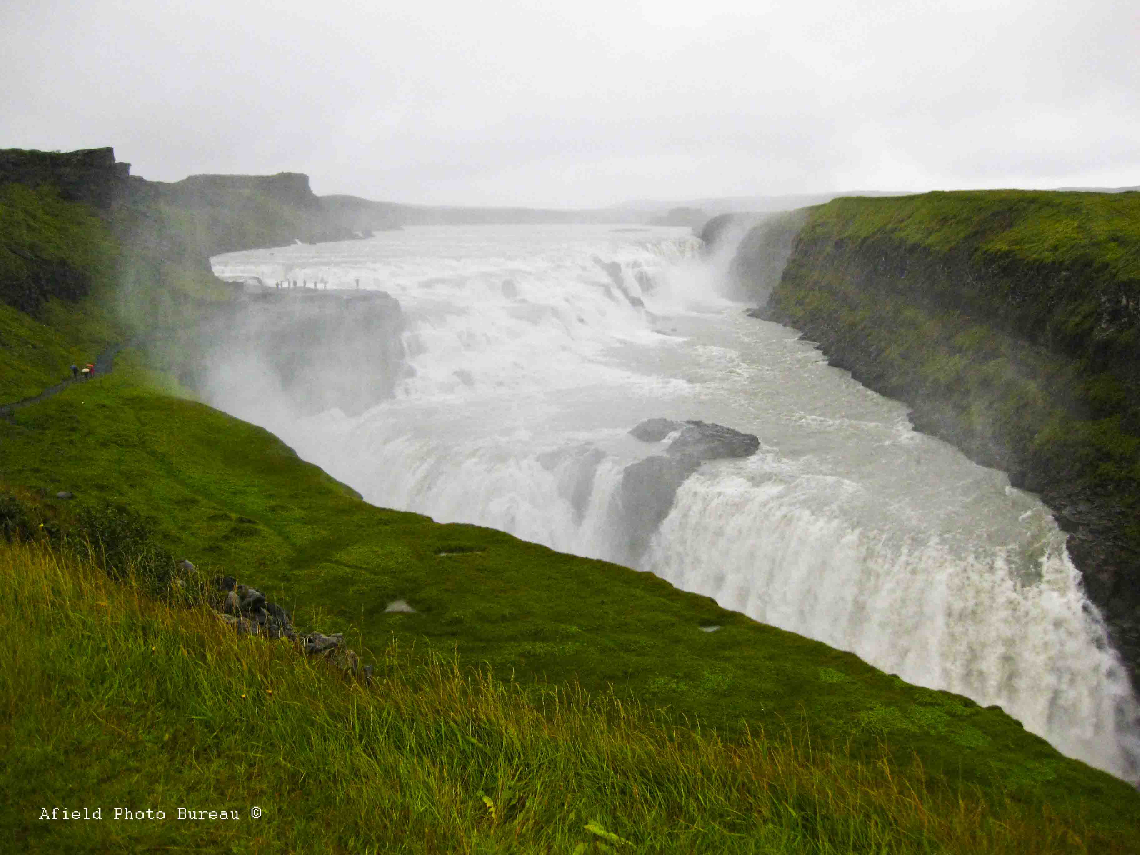 Gullfoss, or Golden Falls, in my mind is a world treasure and it is unbelievable that at one point there were plans to dam the river and virtually kill it. I can guarantee that the first person who walked over the bluff to figure out what all the racket was probably died of surprise on the spot or at least needed a change of furs. The torrent is hidden from passers-by and the only thing that gives away its location from the road is a fine mist hanging a few hundred feet above the floor of the fissure and once out of the vehicle an ominous angry roar can be heard over the cold wind. During preparations for the trip I saw many pictures of the falls but didn’t grasp its massive scale, however, once we were on top of the ridge and saw the tiny people on the jut of land at mid-falls it was then very clear.