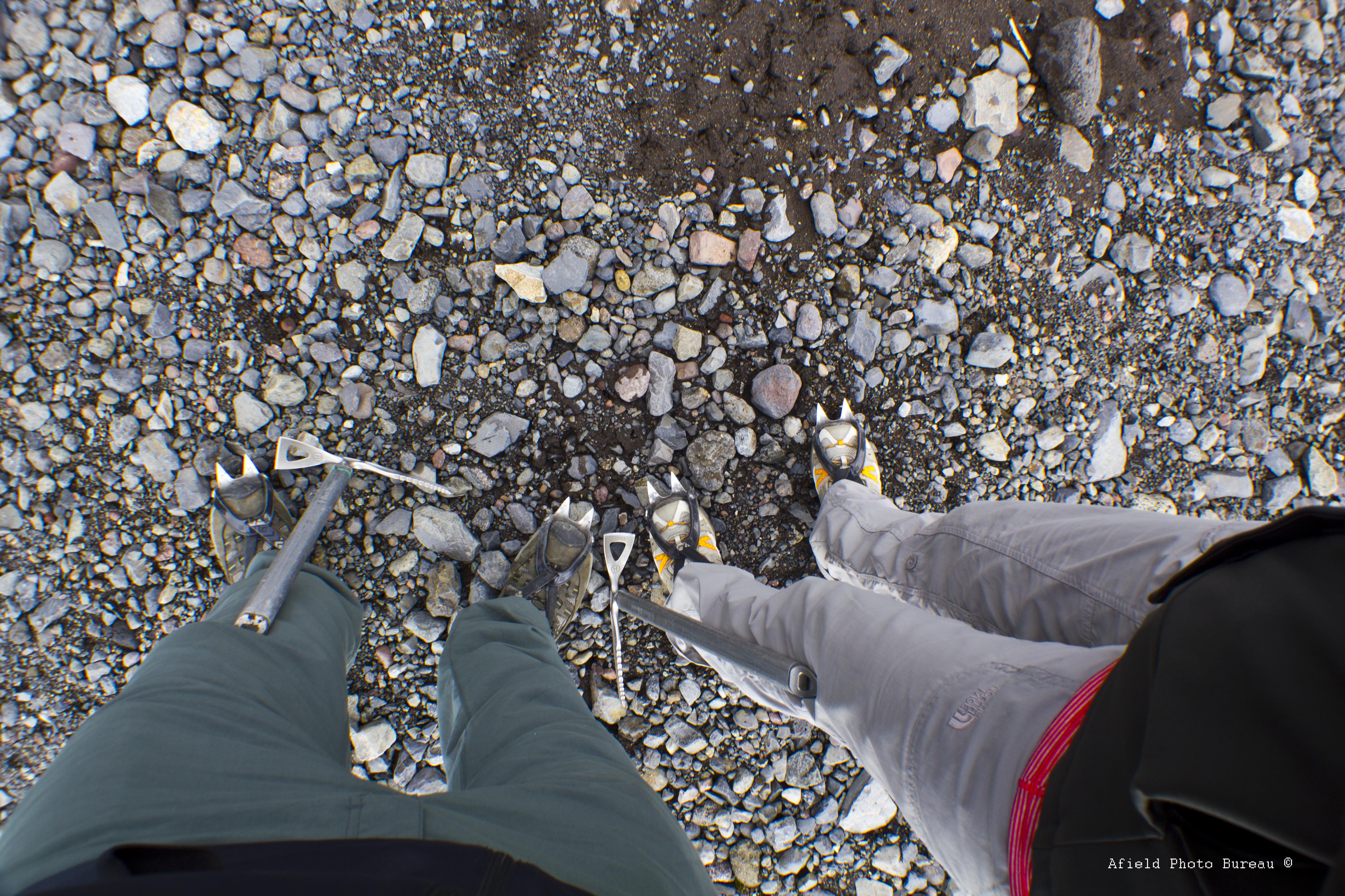 By the time we reached the park headquarters at Skaftafell we had just missed the bus to go on one of the more advanced hikes. We settled on a shorter two-hour trip that was more suited for families and kids (ech, kids), and wasted the time we had before the tour departed by walking down to take a look at the Skaftafell glacier. Just before departure we were sized up for crampons, given an ice axe, and loaded onto a school bus that once faithfully served the Petersburg, VA school district. I like kids and I enjoy horsing around as much as the next guy but if you give an eight year old an ice axe I will show you an ice-axe murderer. We had two such little devils walking on the ice with us and there wasn’t a single minute during the walk that one of them wasn’t hacking away with the fury that only an eight year old can muster when given a dangerous weapon. One of them was there with his mother, an icy German woman with hate in her eyes, and they would elbow and budge and walk off the trail just so they could be the ones walking right behind the guide. Of course we did our best to get in their way and frustrate their attempts at being the guide’s pet, but we finally called it off when the little shit went for a dirty pass causing me to stop short and accidentally rap Blondie on the knee with the business end of my ice axe – Single mom and son – 1, PMO and Blondie – 0. The tour itself was great though and the guide and his trainee daughter were funny and quite smart. I have always had sort of a man crush on anyone who could make their living by being a guide, be it on glaciers, rivers, or somewhere in the backcountry. Our particular tour was on one of the many spur glaciers leading down from the peak of Öræfajökull. It wasn’t a particularly active glacier so we didn’t hear the creaks and cracks that fast-moving glaciers make, but it did not diminish the excitement we felt as we stomped around clumsily on our crampons. We were shown some large crevasses and a very deep moulin that gave everyone who peered over the edge the creeps because if you fell in there would be no way out until the ice thaws.