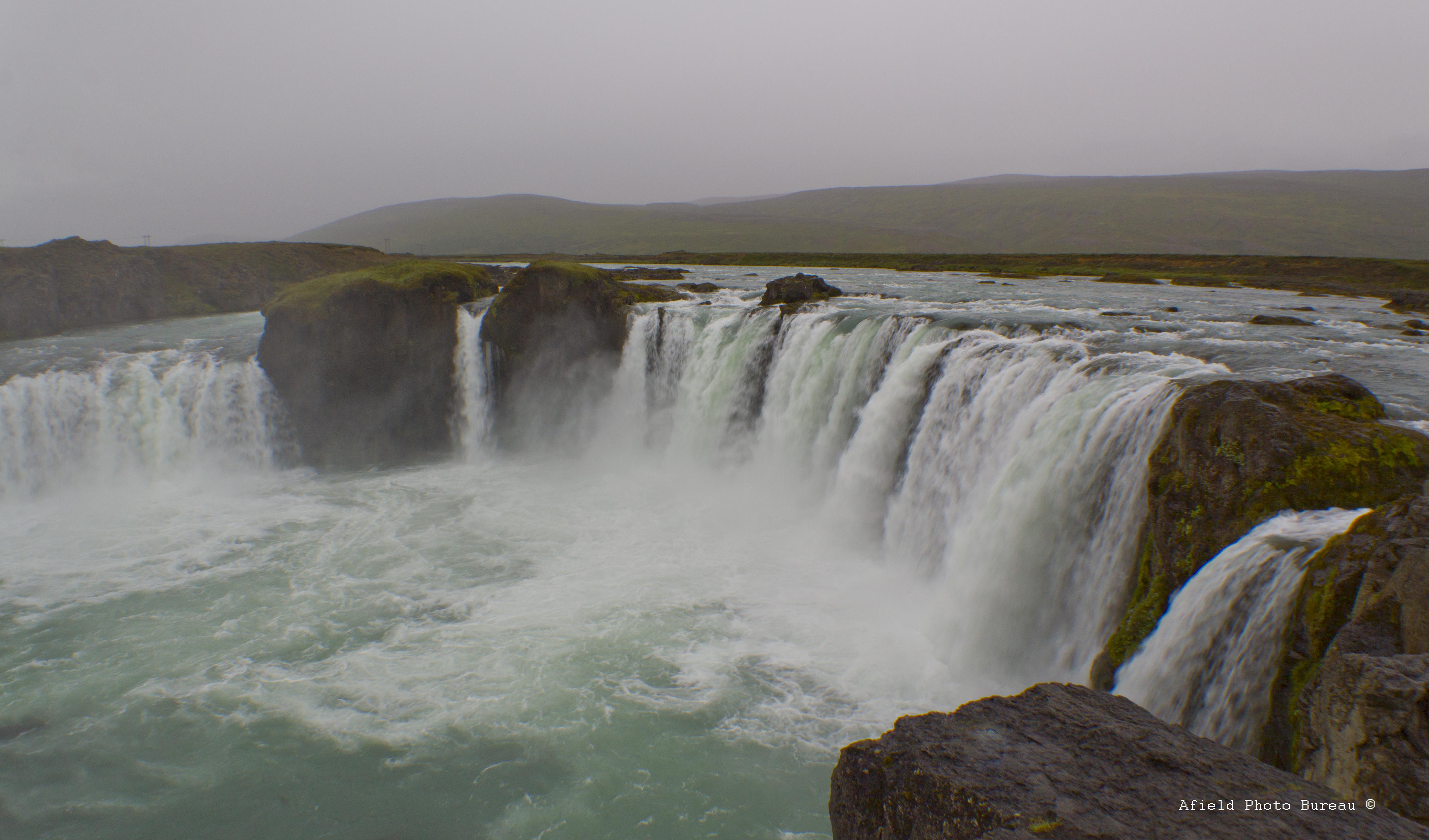 Once the sheep-related excitement died down we loaded up and bid farewell to Myvatn. As soon as we got out of town it started to rain and it didn’t stop for about twenty-four hours. Even though the sky was low and grey it was beautiful in a melancholy way. It reflected the feelings we had about being near the end of our trip. Our first of only a few stops was at Goðafoss, so named because once Iceland converted to Christianity a local leader threw all of his Norse God statues into the river at the falls – that is a man who took his conversion very seriously.