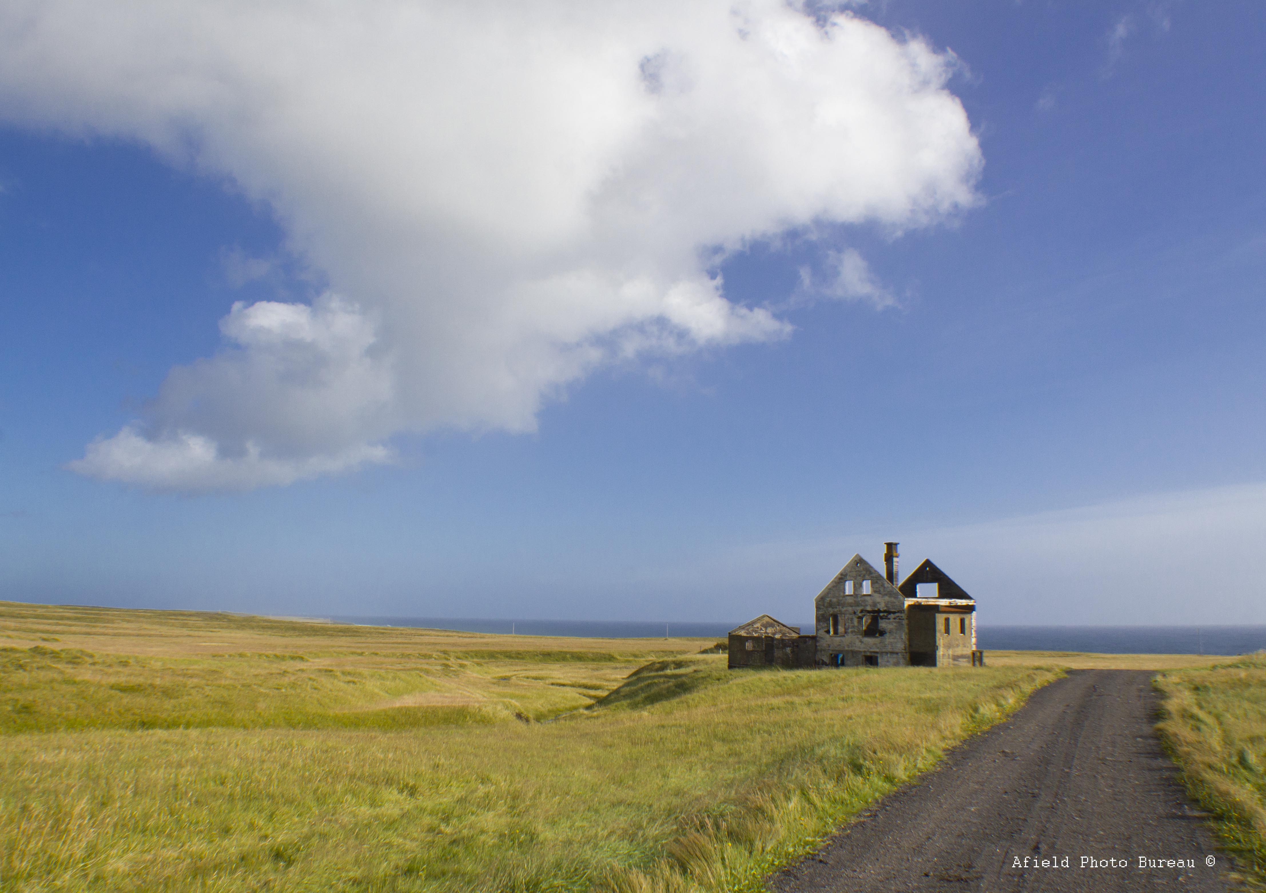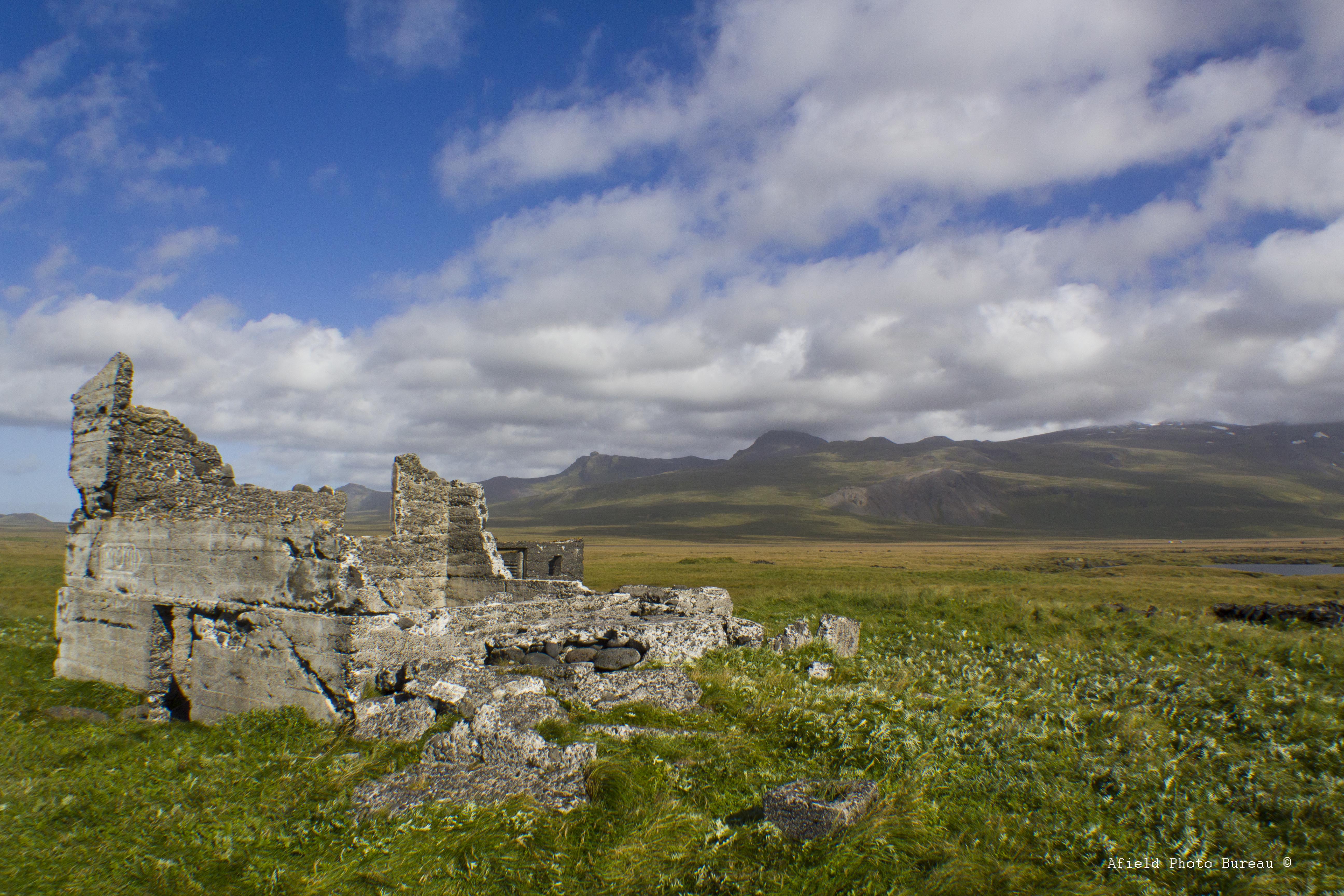 Once we rounded the tip of the peninsula we noticed some ruins sitting across the lava field near the shore so we decided to stop and give it a once over. The two kilometer walk along the beach was rocky but interesting because of all of the weird nautical detritus that has been washed up over the years – huge chunks of metal and foam floats and twisted nets were everywhere. As we got closer to the house I noticed a small brown animal running away from us with great haste. At once I realized that it was the elusive Icelandic fox, iceland’s only native predator mammal, but I was a bit slow on the go getting the camera on him/her so it just looks like a little brown spot in a sea of grass.