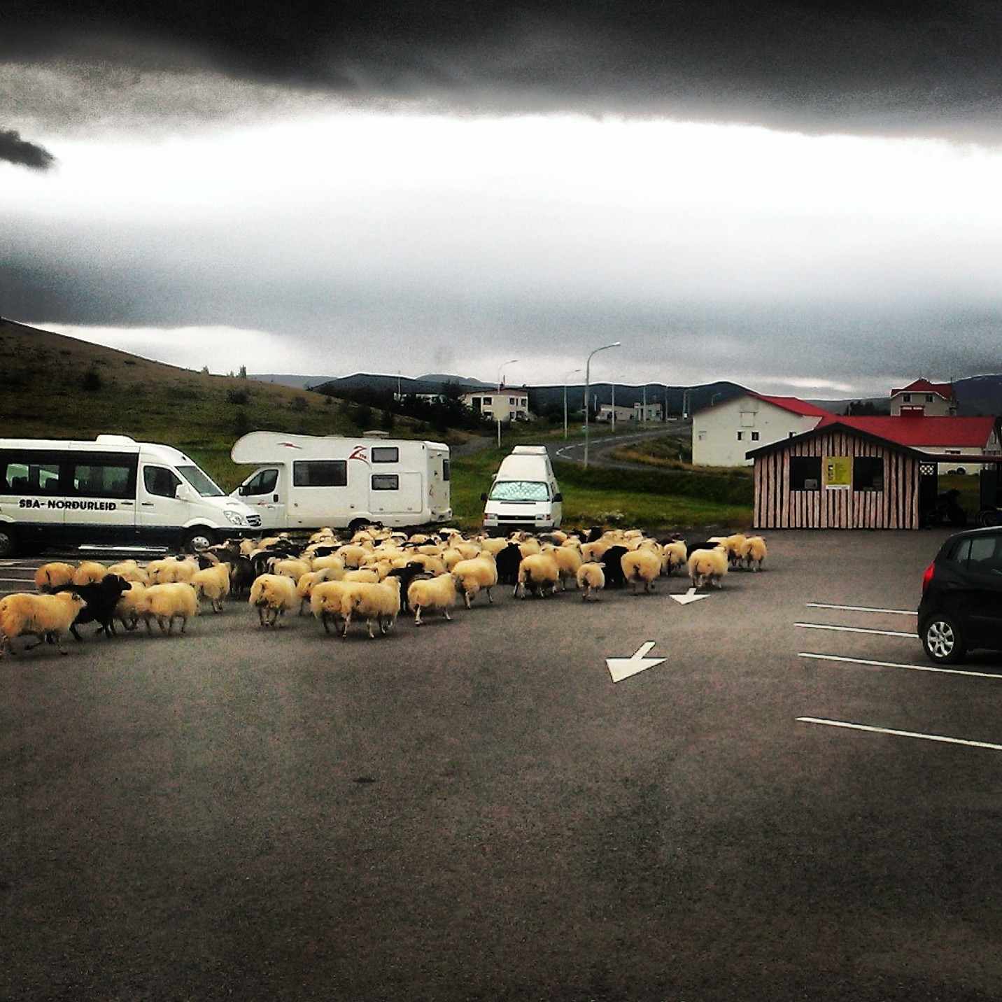 Ok, now to the business at hand. Our last morning on the shores of Myvatn, 30 August 2013, was grey with rain and snow moving in from the west. At breakfast we discussed our route for the day and decided that even though the coastal route was longer we would benefit from being closer to sea level where rain was expected rather than take the overland route and risk getting caught in the snow. Our discussion was interrupted by the sudden appearance of about a two hundred sheep being herded through the parking lot, which is a common thing in Iceland but to those of us at breakfast it was quite thing to see and hear (sheep like to hear themselves talk).